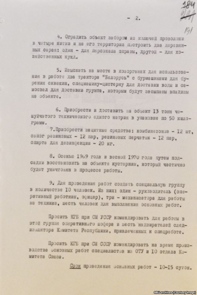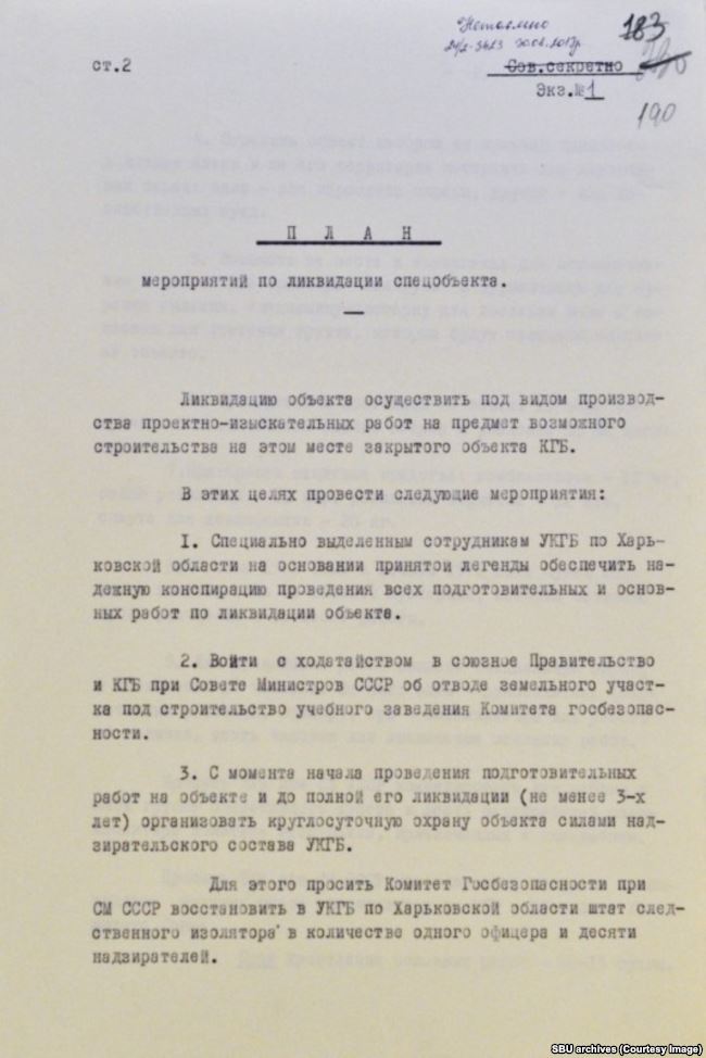 Надалі на цій території доцільно побудувати закритий об'єкт КДБ, наприклад, навчальний заклад, про що слід порушити відповідні клопотання перед Комітетом державної безпеки при Раді міністрів СРСР і Союзною урядом. Витрати, пов'язані з ліквідацією об'єкта, становитимуть орієнтовно близько 10 тисяч рублів ".