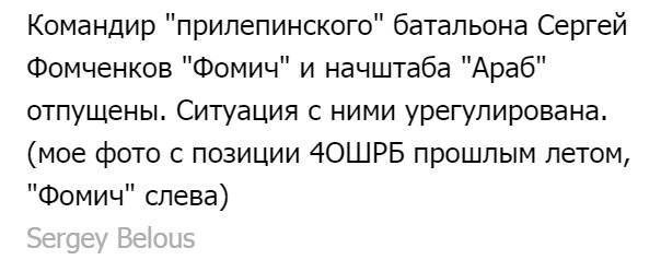 "Командир" прілепінского "батальйону Сергій Фомченков" Фомич "і начштабу" Араб "відпущені. Ситуація з ними врегульована (моє фото з позиції 4ОШРБ минулого літа," Фомич "зліва)", - сказано в повідомленні.
