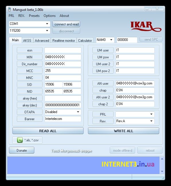 Далі для прошивки будуть потрібні дані для авторизації модему в мережі Intertelecom. Це номер телефону Інтертелекому, десятковий ключ A-key - він однаковий для всіх (00000000000000000001). Пароль і логін для з'єднання - IT / IT, а паролем ідентифікації CHAP - є ESN-номер модему (це якщо оператор не привласнив інший CHAP).