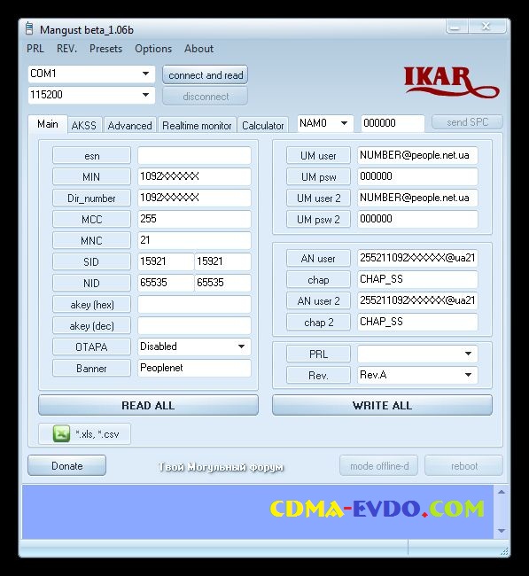 Після того, як з'ясували максимальну швидкість, яку отримаєте в мережі CDMA-UA, вводите потрібні дані в поля Мангуста і записуєте їх у пам'ять апарату як показано на скріншоті.