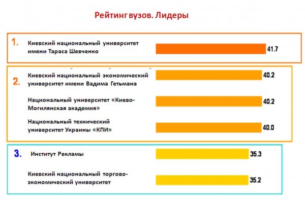 Перше місце отримав Київський національний університет імені Тараса Шевченка, друге поділили Київський національний економічний університет імені Вадима Гетьмана, Національний університет «Києво-Могилянська Академія» та Національний технічний університет України «КПІ». Третє місце дісталося Інституту Реклами і Київському національному торговельно-економічному університету.