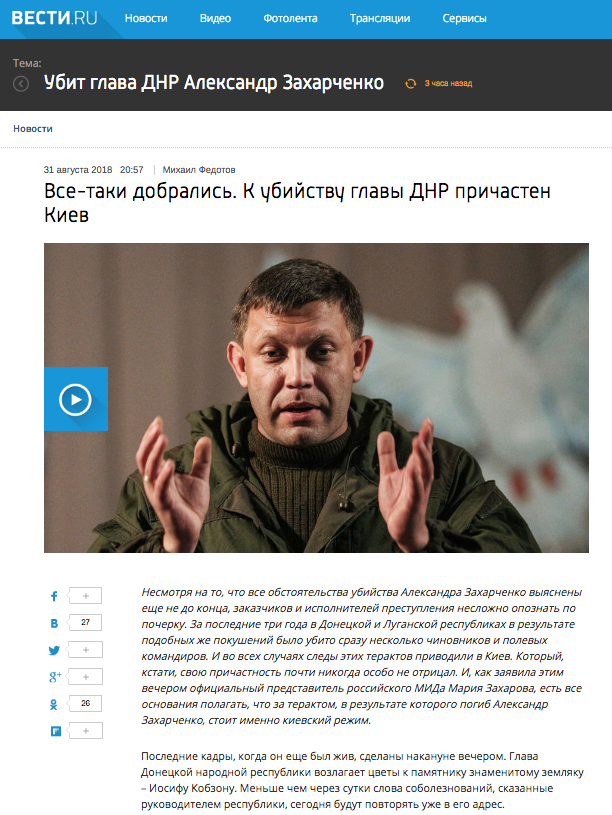Свій вердикт винесли і "Вести.ру": "Очевидно, що вбивство Олександра Захарченко - політичне замовлення офіційного Києва, який вже давно не гребує використовувати терористичні методи в боротьбі з республіками південного сходу України. Виконавців не збентежило навіть те, що підрив був запланований в самому центрі Донецька. На бульварі Пушкіна могли знаходиться десятки, а то і сотні мирних громадян ".