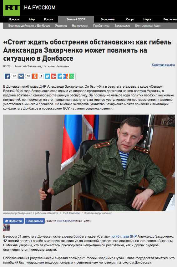 Загострення обстановки на Донбасі прогнозує RT.com. Експерти пропагандистського ресурсу стверджують, що "завдяки Захарченко Донецька республіка змогла вижити в найтяжчих умовах", а його смерть може спричинити "ескалацію конфлікту і провокацій ВСУ на лінії зіткнення".