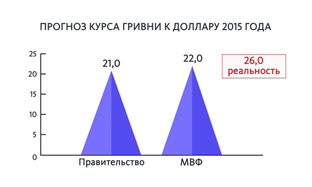 На початку жовтня 2014 року голова Національного банку Валерія Гонтарєва запевняла, що курс валюти закріпиться в межах 12 грн / USD. Рівно через 4 місяці офіційний курс НБУ різко виріс до 23 грн / USD. А потім, після досягнення пікового значення 30 грн / USD в кінці лютого 2015 року, коливався в межах 22-24 грн / USD.