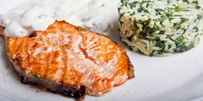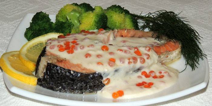 Надзвичайно ніжним на смак і привабливим зовні виходить стейк із сьомги з вершками. Цей продукт ідеально поєднується з м'якоттю риби. Щоб додати страві гостроту, варто додати трохи гірчиці дижонской: так ви отримаєте неповторний аромат, який ви відчуєте ще при запіканні. Гостям блюдо можна подати з гарніром з бурого рису або картопляного пюре.