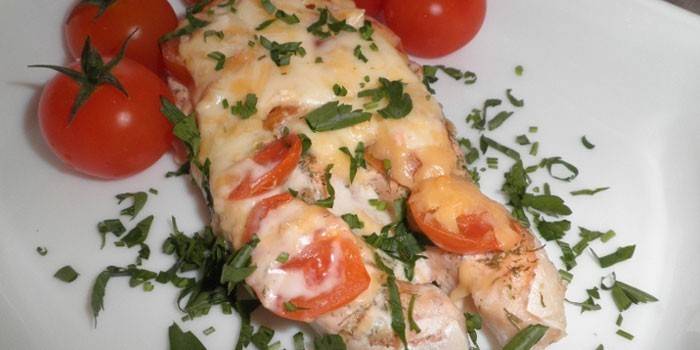 - Потім форму дістати, покласти змащене приправами філе разом з помідорами.