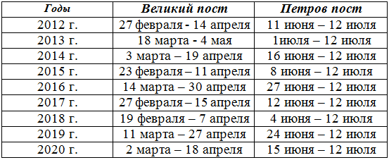 Багатоденних постів в році чотири. Найтриваліший і строгий - Великий Піст, який триває сім тижнів перед Великоднем. Найсуворіші з них - Перша і остання, Страсна. Цей піст встановлений в пам'ять сорокаденного посту Спасителя в пустелі. У перший день першого тижня - в понеділок - є не личить, також і у вівторок. У середу подаються хліб і варені овочі. Ті, хто не може обходитися без їжі перші два дні, їдять хліб і квас. У суботу та неділю дозволяється рослинна олія і вино. Близький за суворістю до Великого Успенський піст, але він коротший - з 14 по 27 серпня. Цим постом Свята Церква шанує Пресвяту Богородицю, Яка, стоячи перед перед Богом, незмінно молиться за нас. У ці суворі пости (Великий і Успенський) рибу можна їсти тільки три рази - в свята Благовіщення Пресвятої Богородиці (7 квітня), Входу Господнього в Єрусалим (за тиждень до Пасхи) і Преображення Господнього (19 серпня).