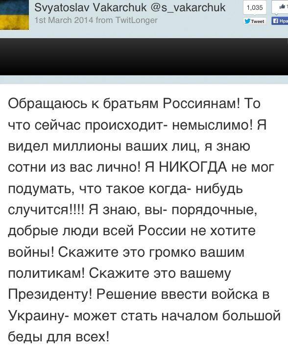 На що Святослав Вакарчук відповів постом в Твітері про премію в 1 млн рублів тому, хто надасть відео, де він виступає з "антиросійською позицією".
