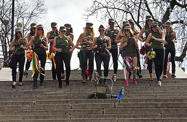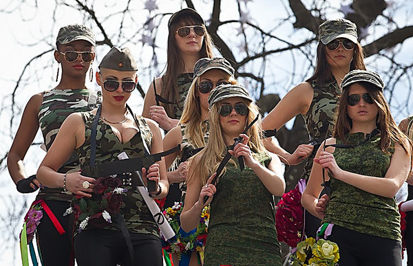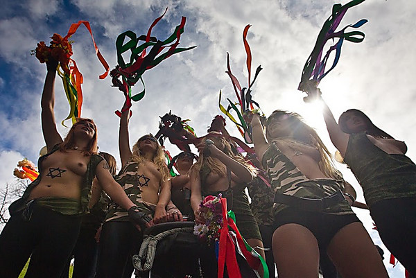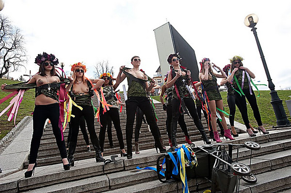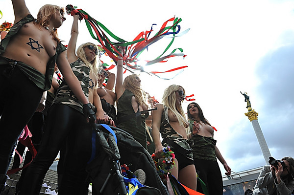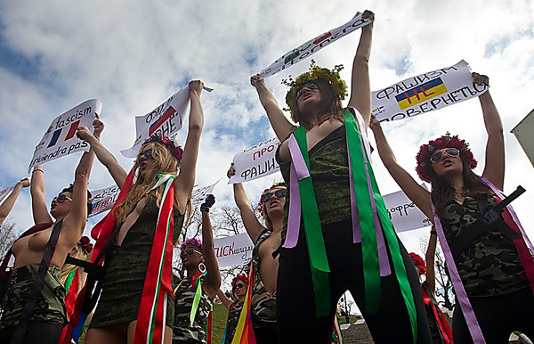 FEMEN-пацифістки розірвали на собі мілітаристський одяг як символ опору нацистському ренесансу в Україні. «Фашизм не повернеться!» - звучало над Майданом на десяти мовах народів світу.