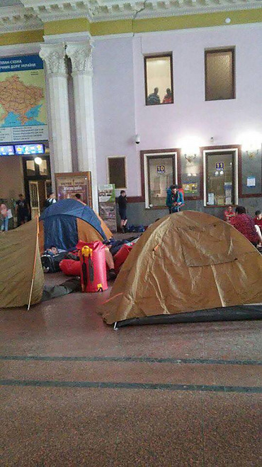 У будівлі головного залізничного вокзалу Львова туристи розклали намети, протестуючи проти відмови замінити їм квитки через запізнення поїзда.