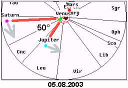 А в поточний (2003) рік Юпітер все далі відходить від Сатурна, складаючи кут градусів 50 (дивлячись з боку Сонця).