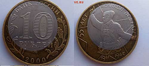 - Вартість "55 років Перемоги", випущеної в 2000 році, залежить від клейма монетного двору. Примірники із позначкою ММД оцінюються в 60 руб, з клеймом СПМД - близько 100 руб.
