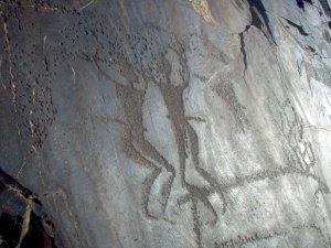 Є фігури мисливців, а також шаблі з довгим лезом, клинки, луки і сагайдаки. Петрогліфи цього часу, як правило, розташовані в стороні від головних композицій більш раннього часу. Мабуть, художники сакського періоду могли використовувати тільки крайні межі скелі, так як основні площини каменю вже були зайняті зображеннями, виконаними їх попередниками. У деяких випадках малюнки вибивалися поверх древніх зображень, в свою чергу, на них наносилися зображення в наступну епоху.