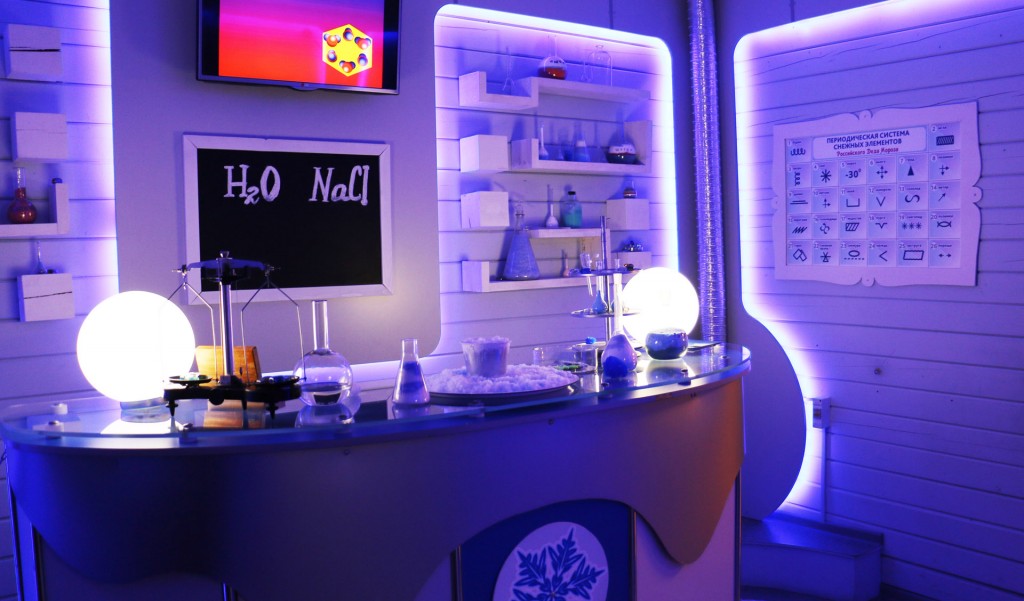 Є кабінет, спальня і навіть гардеробна! В обсерваторії і лабораторії Дідусь займається наукою. Наприклад, він розробив власну періодичну систему - "снігових елементів".