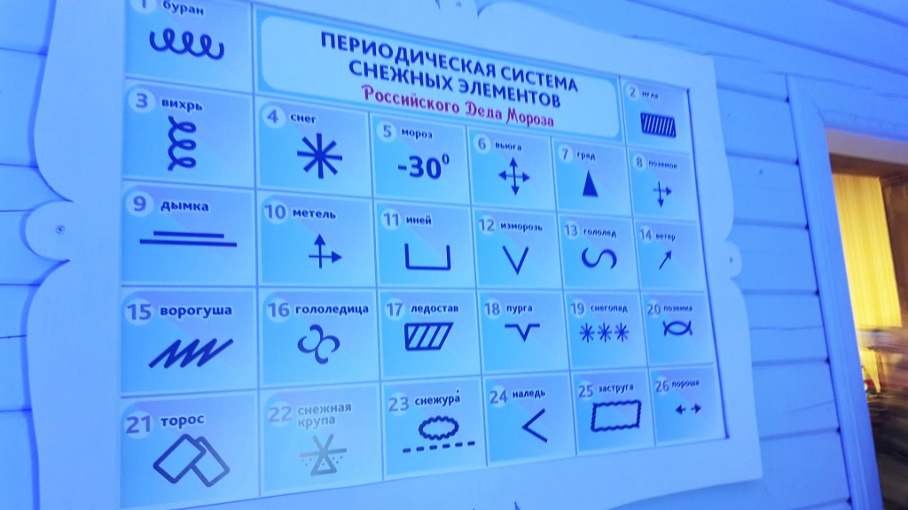 У різних кімнатах можна побачити ціпки. Один з них, наприклад, призначений для подорожей і оснащений системою ГЛОНАС, що теоретично дозволяє спостерігати за переміщеннями Діда Мороза. Але його я не сфотографувала, тому вивчіть все-таки цю періодичну систему
