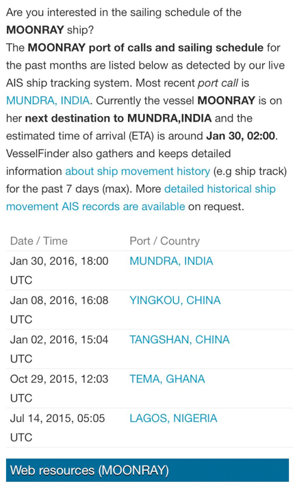 Так ось: 29 жовтень 2015 року Moonray реєструвався в порту Гани, 2 січня 2016- го - біля берегів Китаю. Ні в портах ПАР, ні де-небудь в Чорному морі судно не знаходилося.