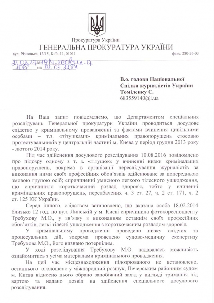 "Під час досудового розслідування було винесено підозра одному з" тітушек ", який ймовірно скоїв ряд злочинів. Зокрема, можливо, організував напад на журналістів за їхню професійну діяльність. А також заподіяв фотокореспонденту Максиму Требухова легкі тілесні ушкодження, які спричинили за собою короткочасний розлад здоров'я ", - йдеться в листі, який ми отримали з ГПУ.