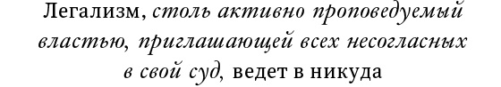 Легалізм, настільки активно проповідує владою, яка запрошує всіх незгодних в свій суд, веде в нікуди. Соромити працівників судової системи, що зневажають саму ідею права, - як і раніше необхідна праця, але цього недостатньо. Відмити право можна тільки після зміни режиму, який не може навіть називатися державою в повному розумінні слова, оскільки начисто заперечує це саме право.